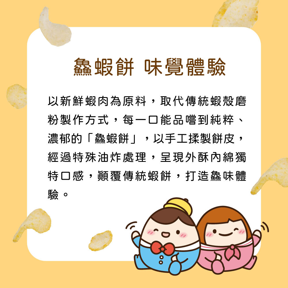 以新鮮蝦肉取代傳統蝦殼磨粉,蝦味更濃更鮮。手工揉製餅皮,經特殊油炸與塑形工序,打造一口即食的「鱻蝦餅」,顛覆印象中的蝦餅口感,綿密中帶酥脆。