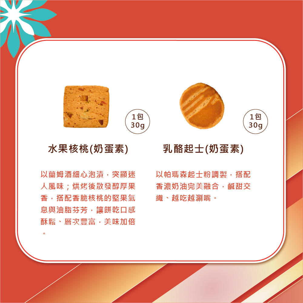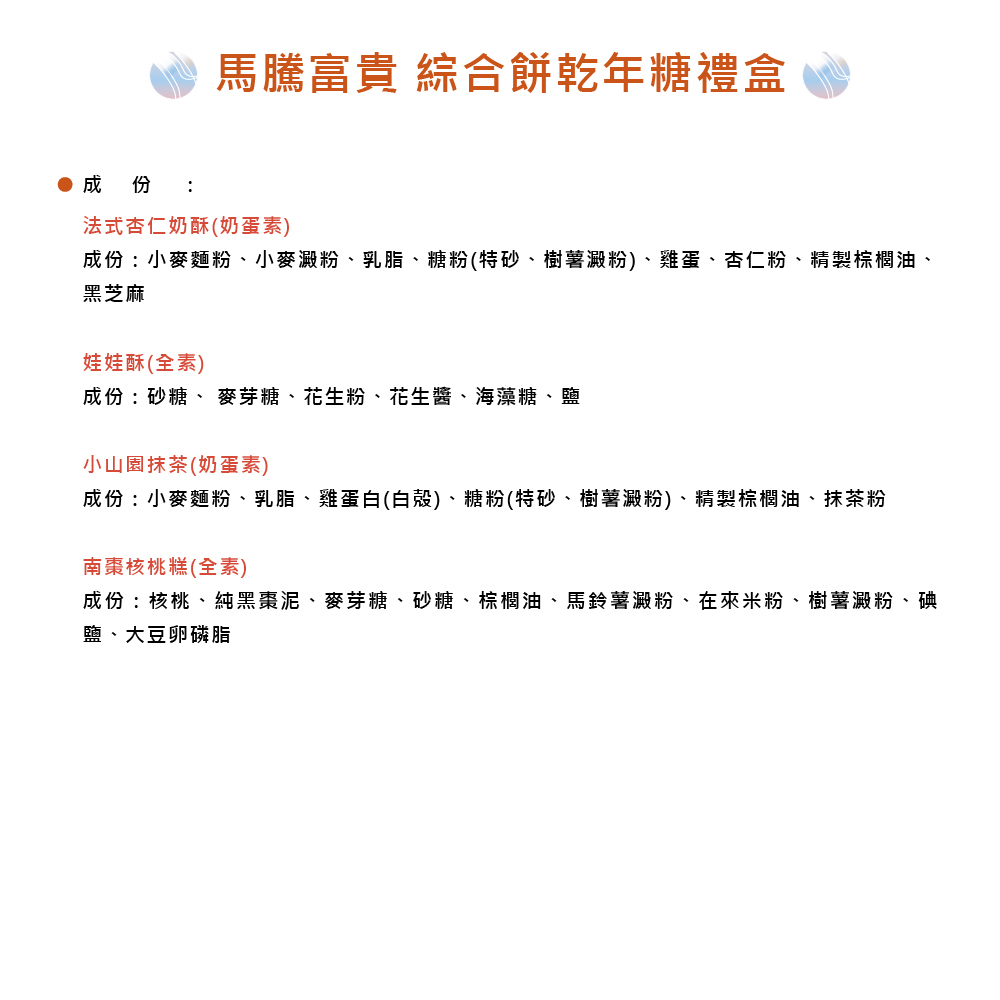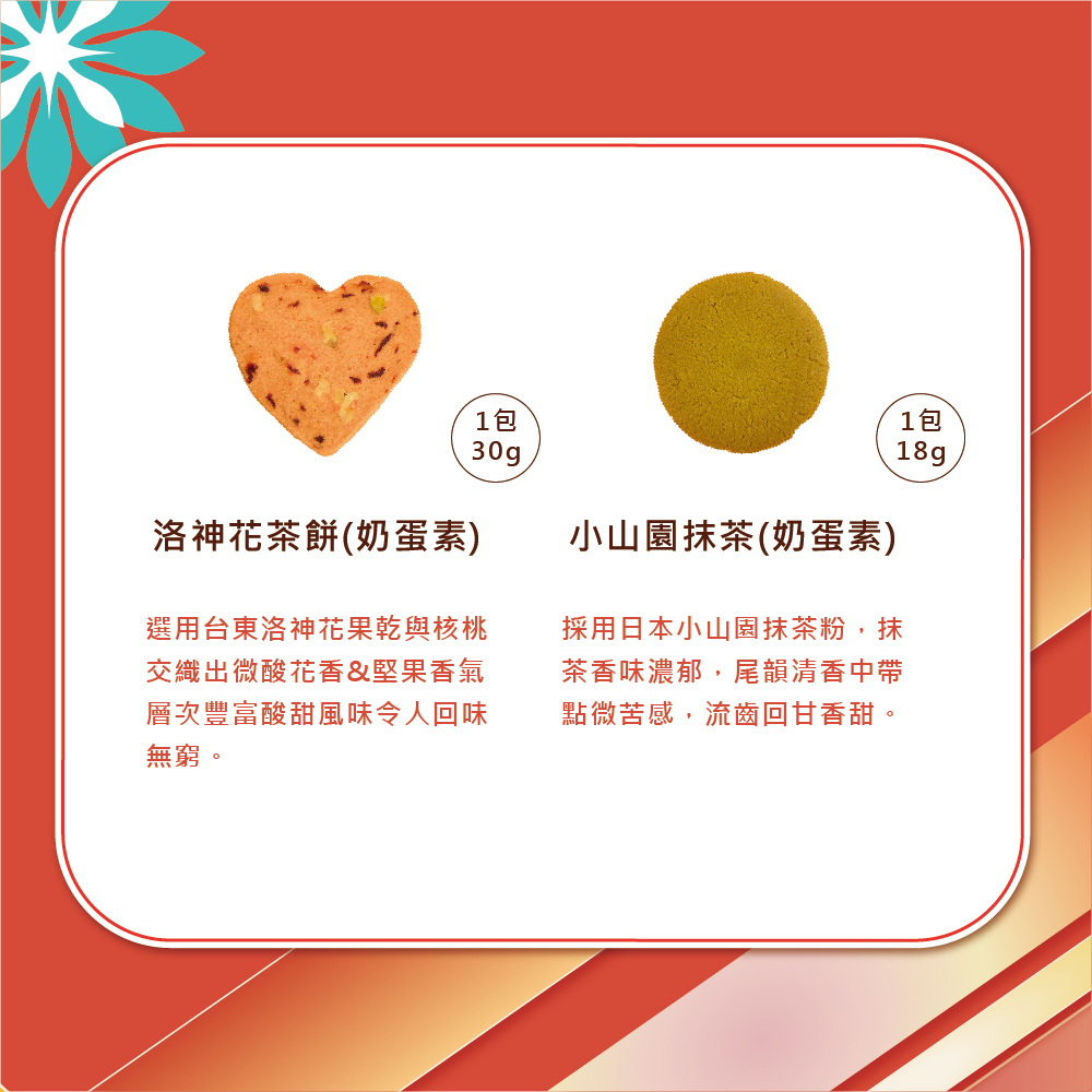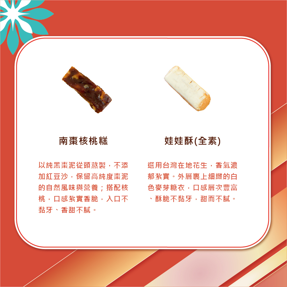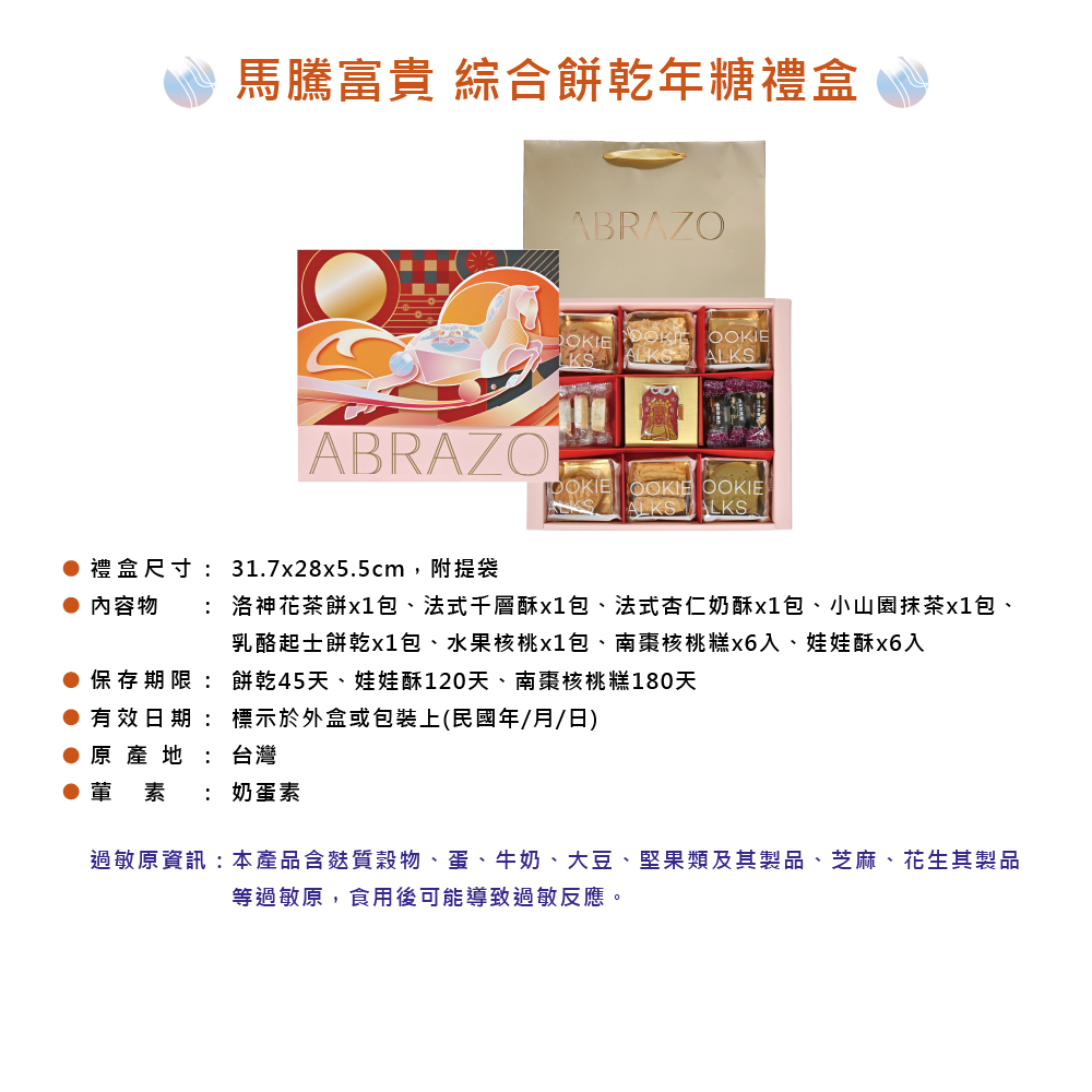 規格:南棗核桃糕x6入、娃娃酥x6入、水果核桃x1包、洛神花茶餅x1包、法式千層酥x1包、法式杏仁奶酥x1包、小山園抹茶x1包、乳酪起士x1包、平安符x1入