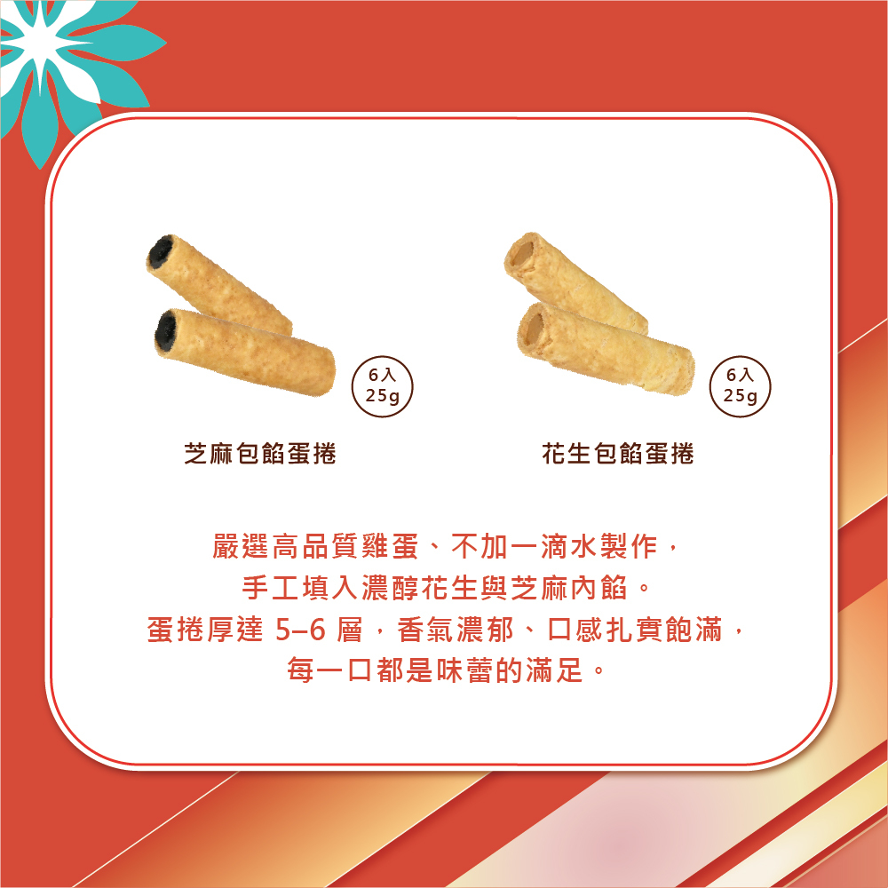 規格:花生包餡蛋捲x6支、芝麻包餡蛋捲x6支