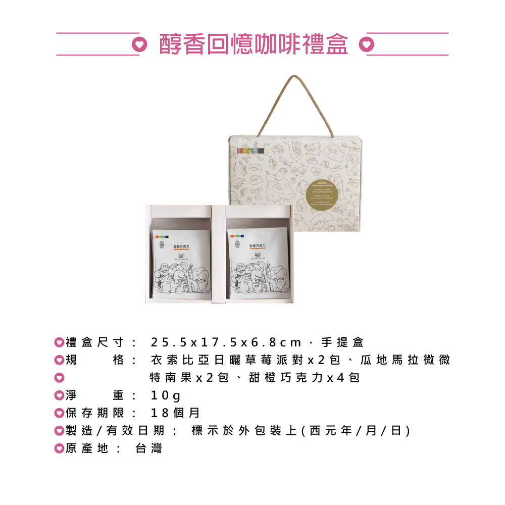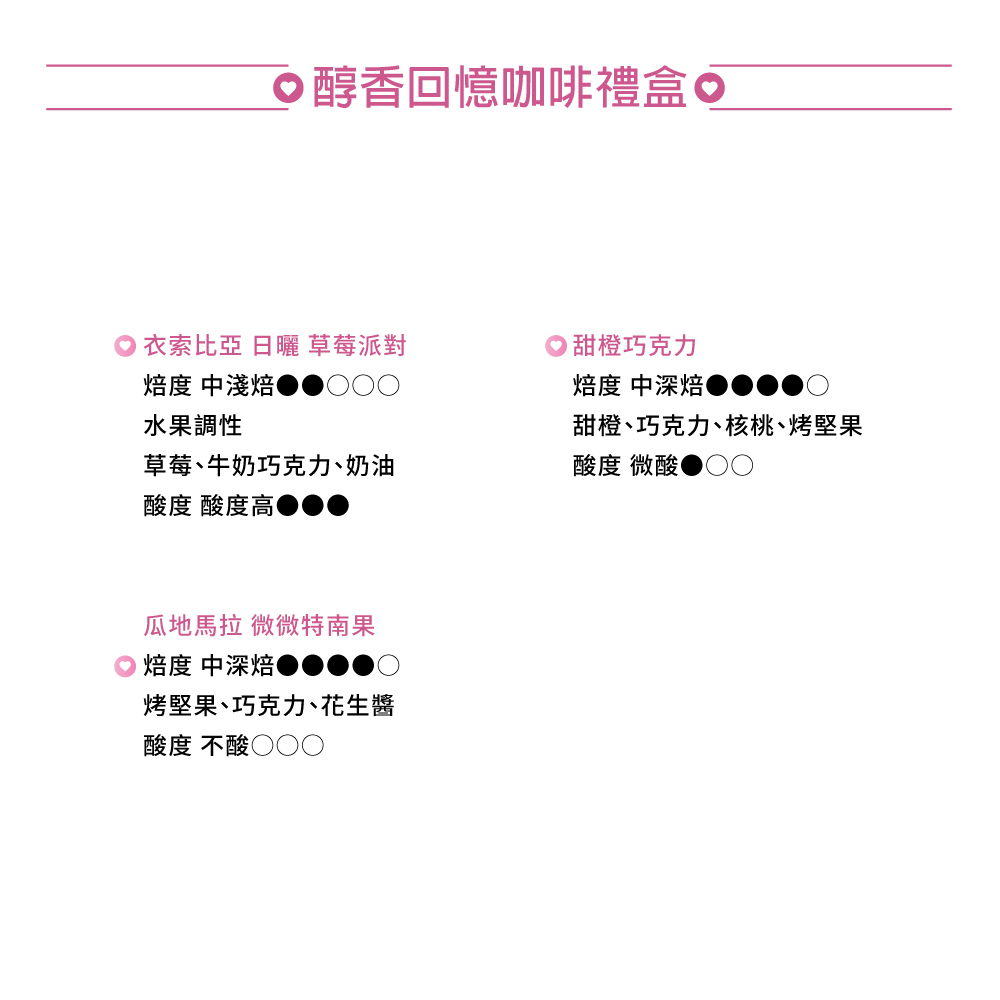 規格:衣索比亞 日曬 草莓派對x2包、瓜地馬拉 微微特南果x2包、甜橙巧克力 x4包