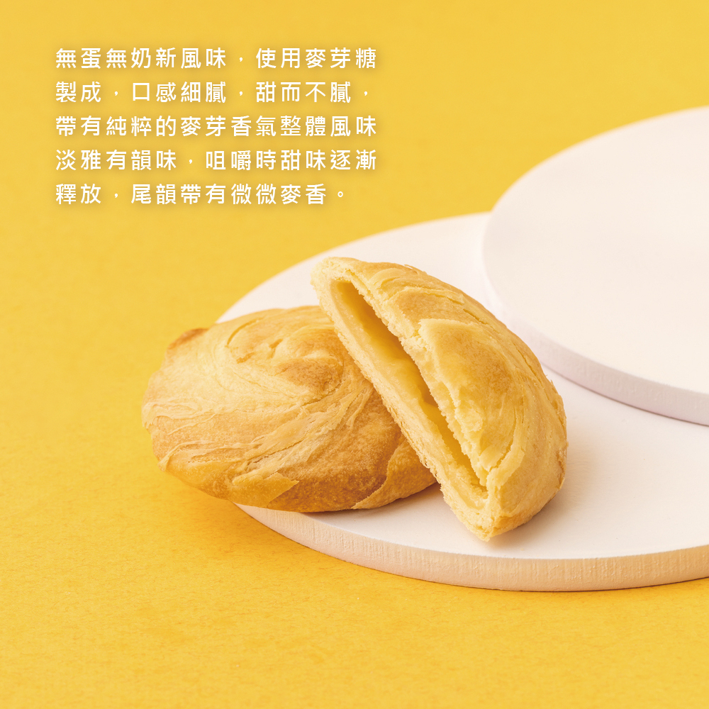 無蛋無奶的新風味,使用麥芽糖製成,口感細膩,甜而不膩,帶有純粹的麥芽香氣整體風味淡雅有韻味,咀嚼時甜味逐漸釋放,尾韻帶有微微麥香。