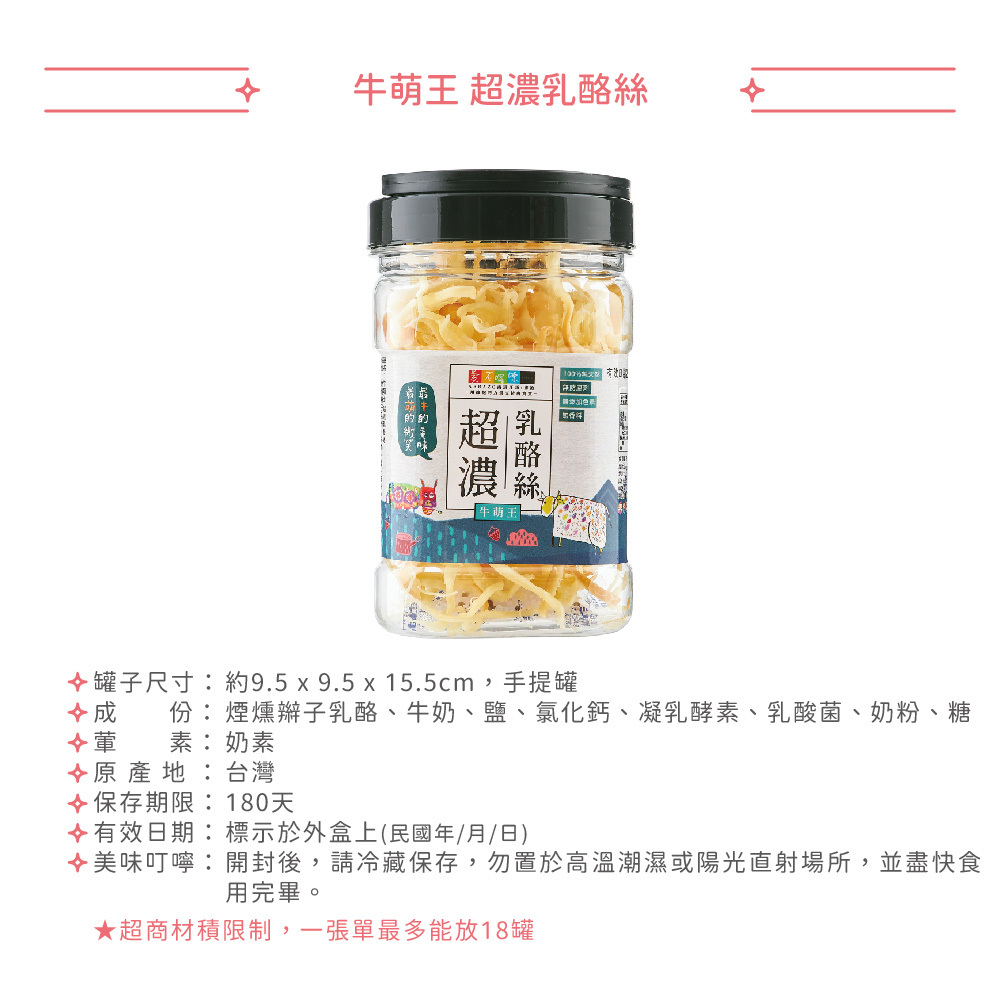 18公升的新鮮牛奶才提煉1公斤乳酪100%牛奶製作,濃郁爆表的原味乳酪絲,美味涮嘴,細緻乳酪香香入口加入麥芽糖口感微甜,無添加色素、無香料、無防腐劑