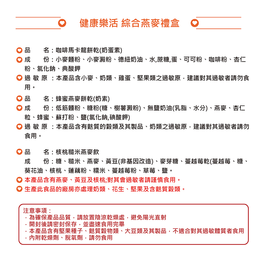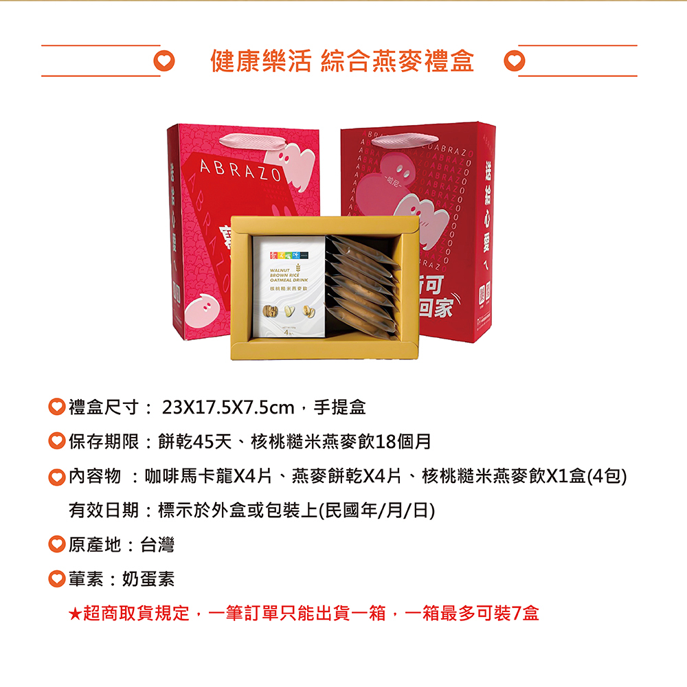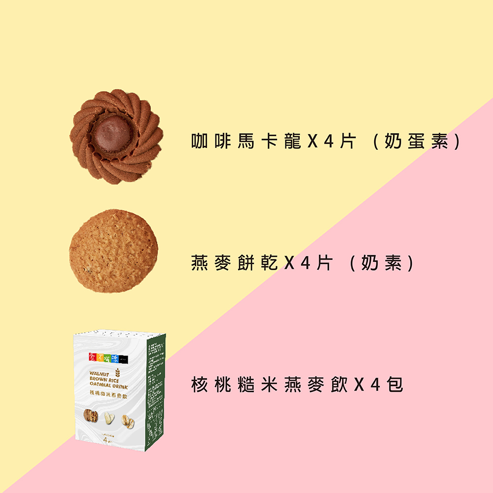 規格: 咖啡馬卡龍 x4片、燕麥餅乾 x4片、核桃糙米燕麥飲x 1盒(4包)