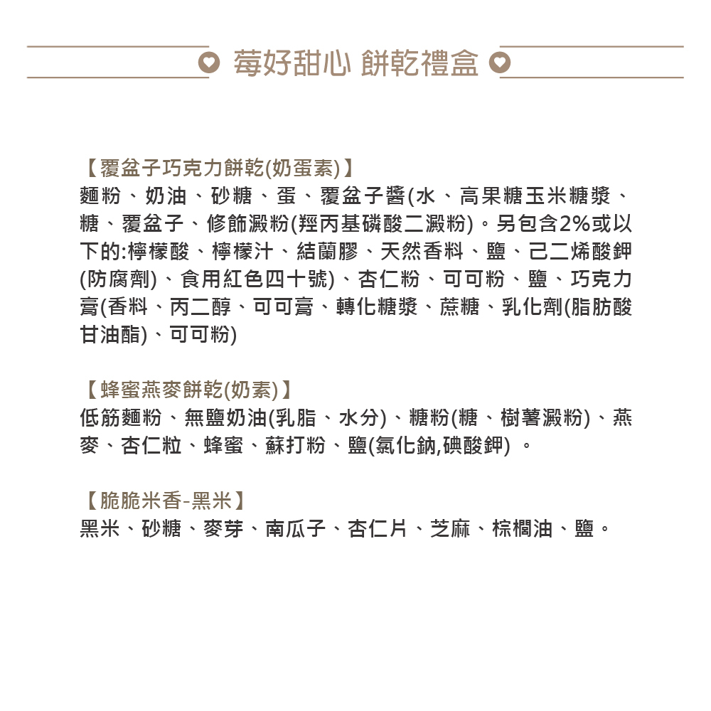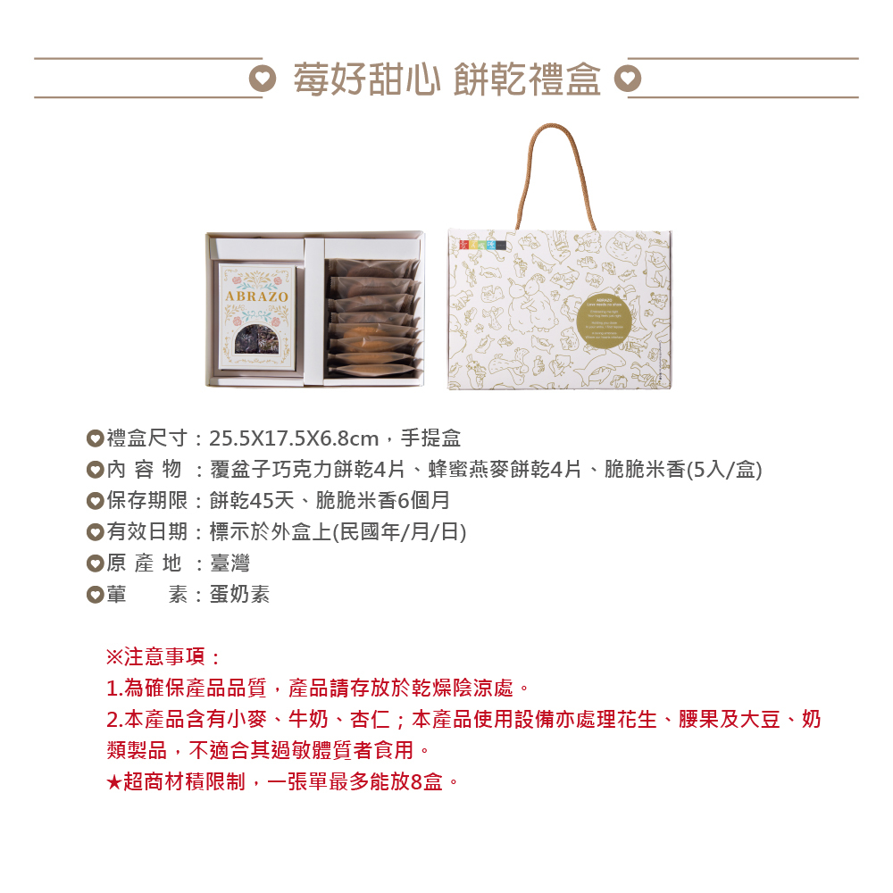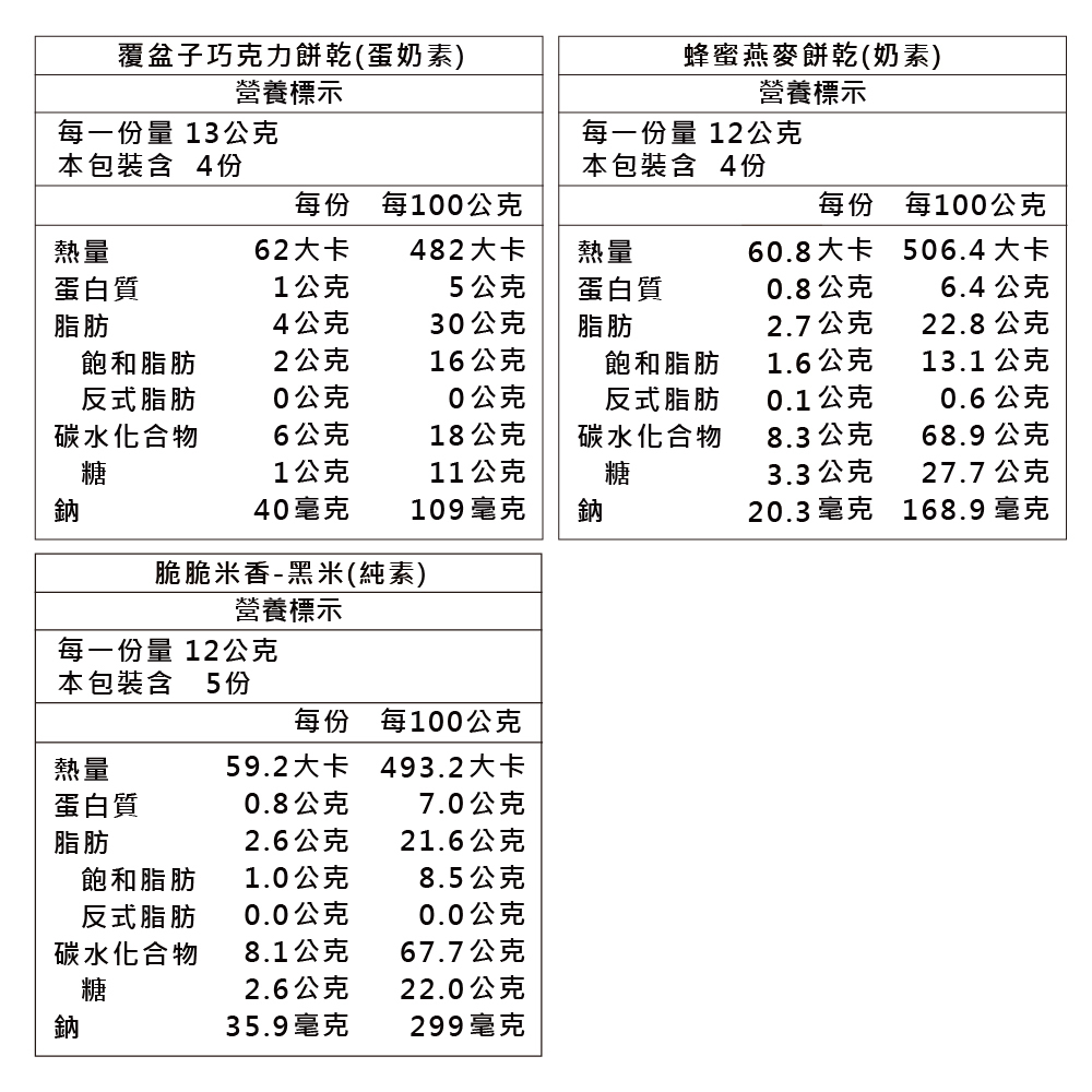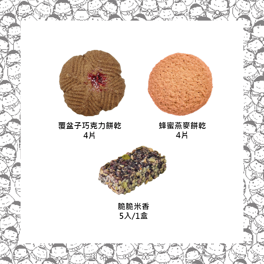 內含覆盆子巧克力餅乾4片、蜂蜜燕麥餅乾4片、脆脆黑米香(5入/盒)