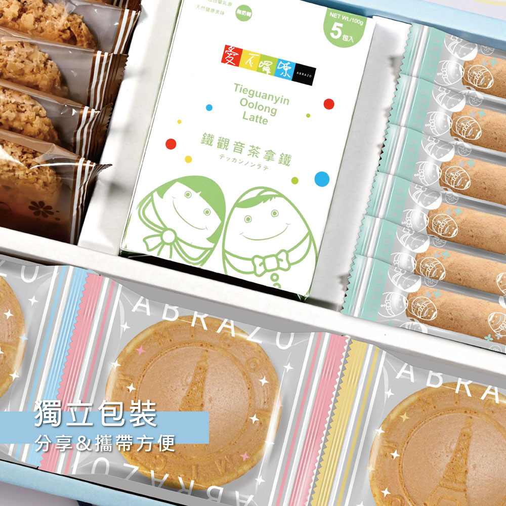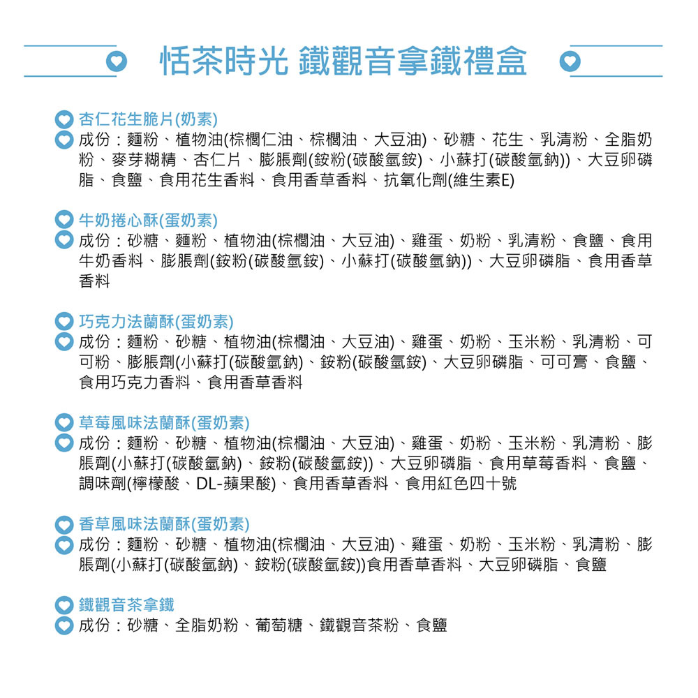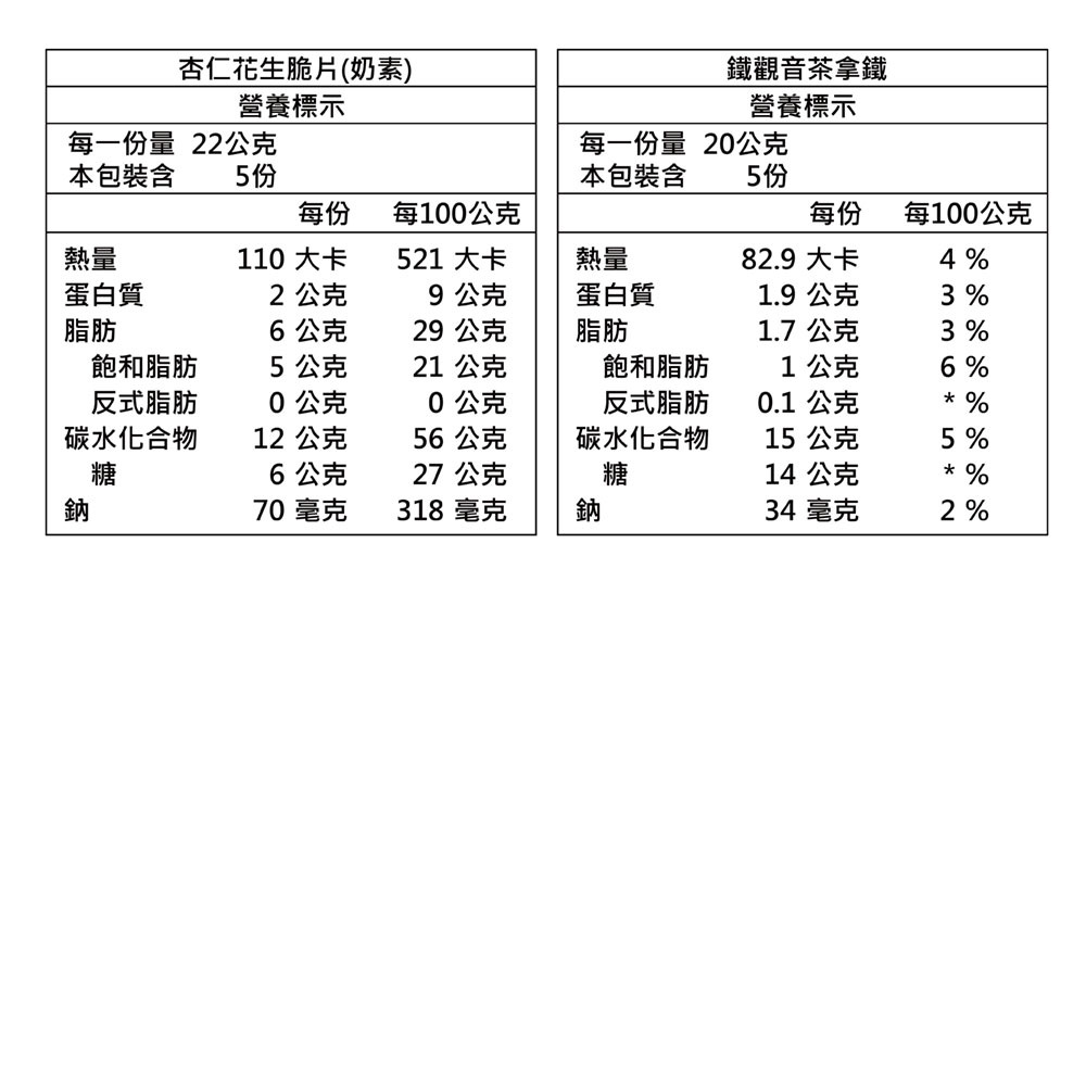 2.草莓法蘭酥x5片、巧克力法蘭酥x5片、香草法蘭酥x5片、杏仁花生脆片x5片、牛奶捲心酥x12支、鐵觀音拿鐵即溶包x5包