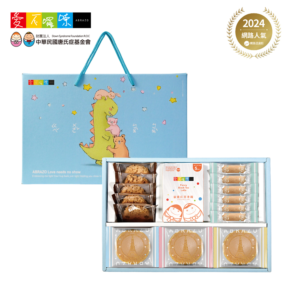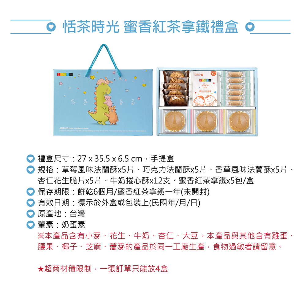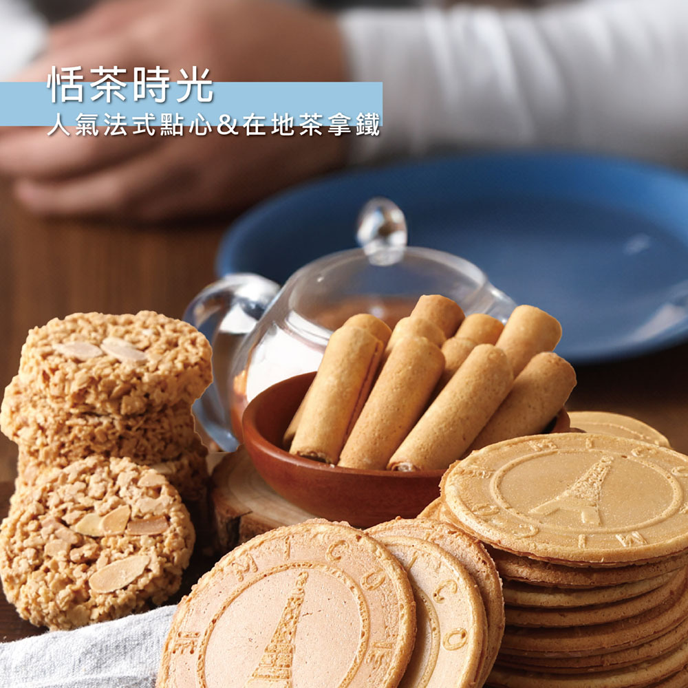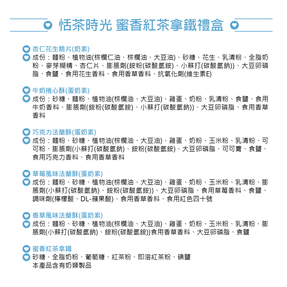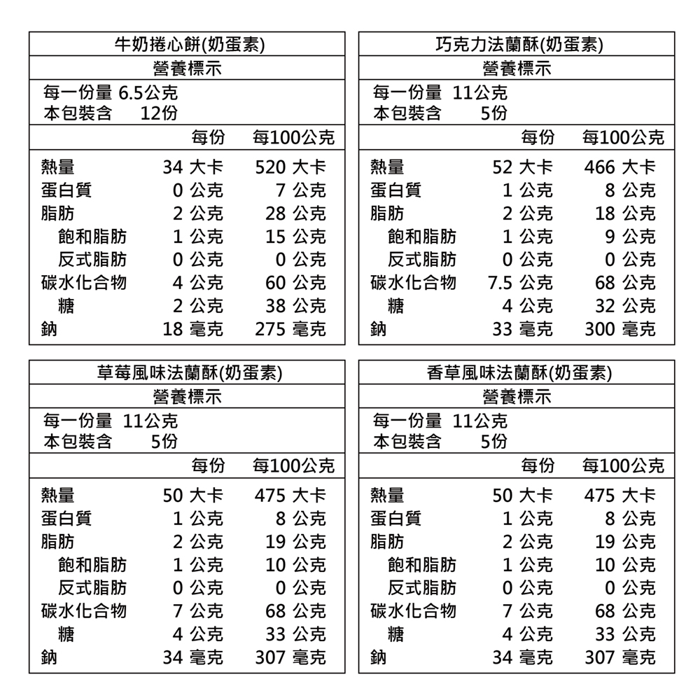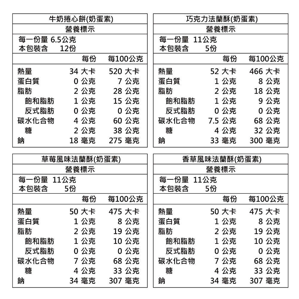 1.草莓法蘭酥x5片、巧克力法蘭酥x5片、香草法蘭酥x5片、杏仁花生脆片x5片、牛奶捲心酥x12支、蜜香紅茶拿鐵即溶包x5包