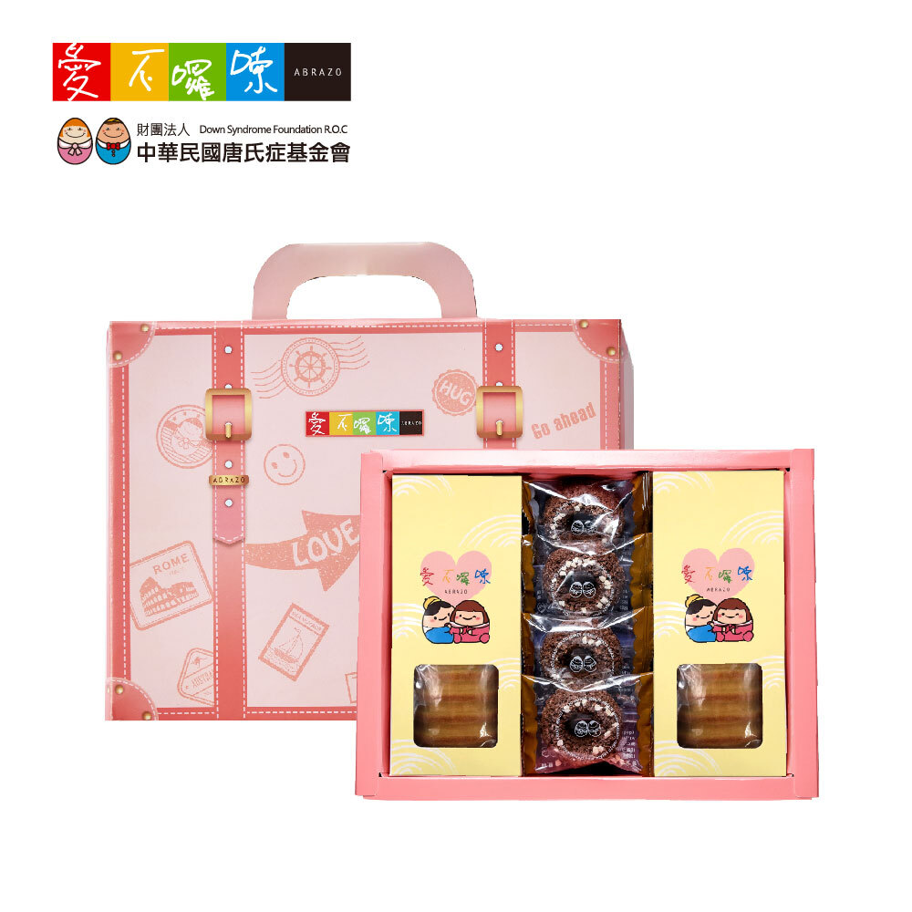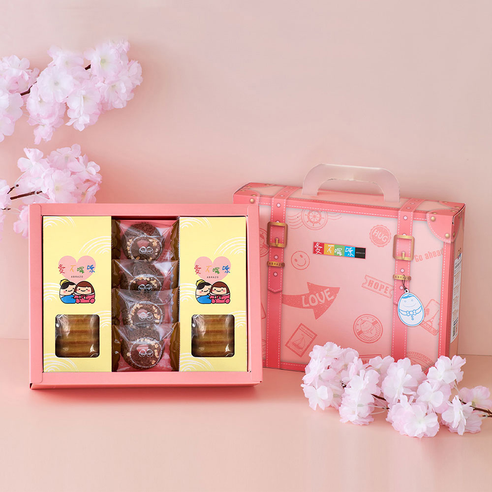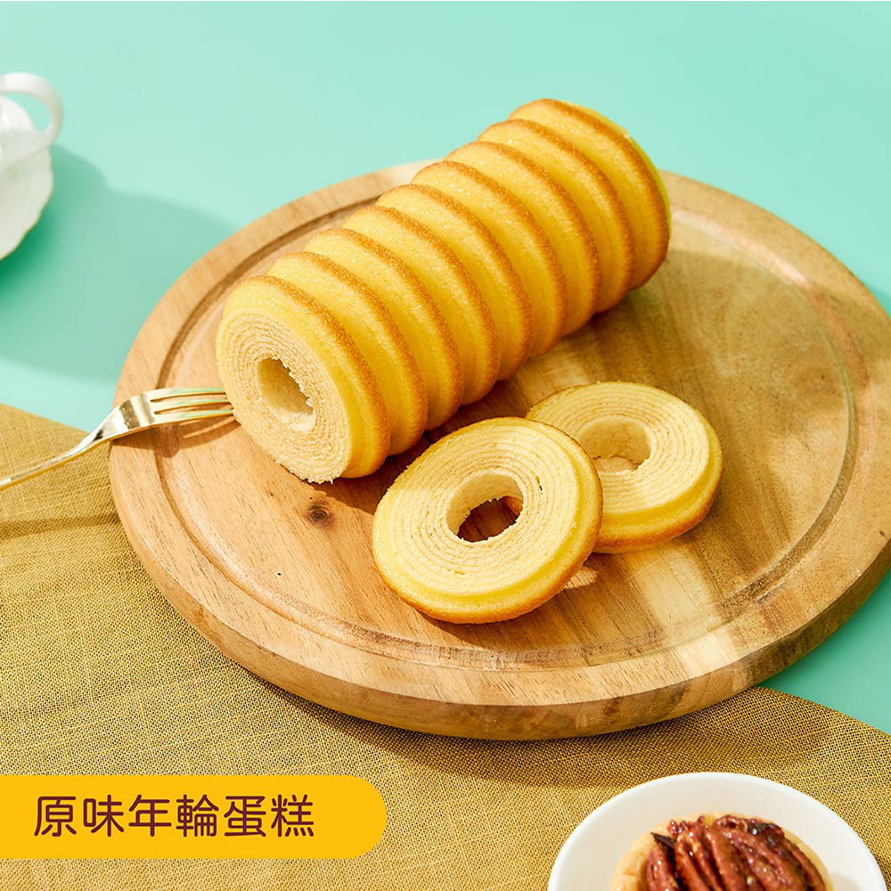禮盒內容物:年輪蛋糕 160gx2條、杏仁巧克力甜甜圈X4顆