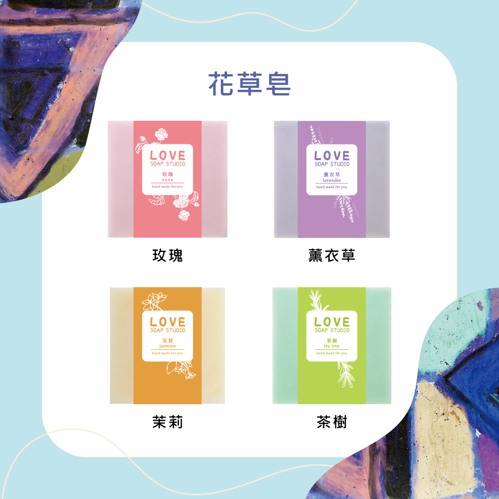 花草精油皂將大自然的純淨香氣,封存在每一塊方正溫潤的手工皂裡。